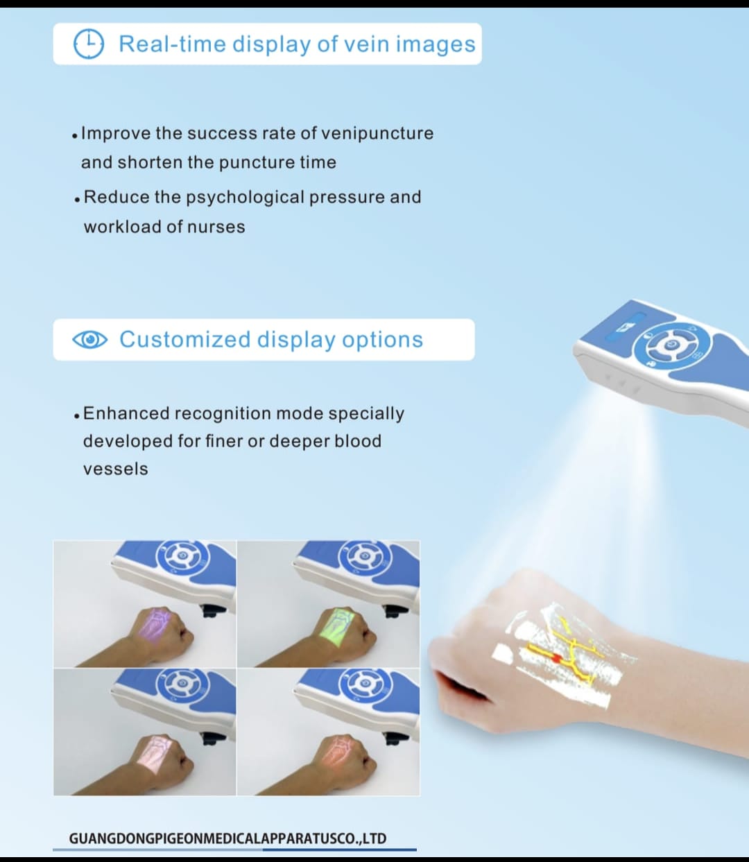 The device uses near-infrared light absorption differences in tissues to clearly display veins.