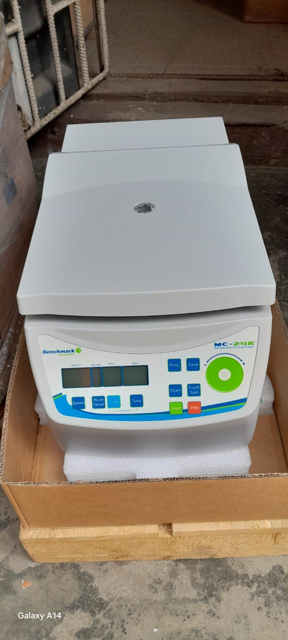 Benchmark MC-24R Refrigerated High Speed Microcentrifuge. This laboratory instrument is designed for separating components of small liquid samples in molecular biology and clinical settings.
